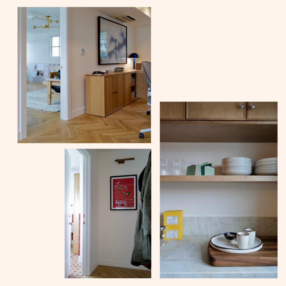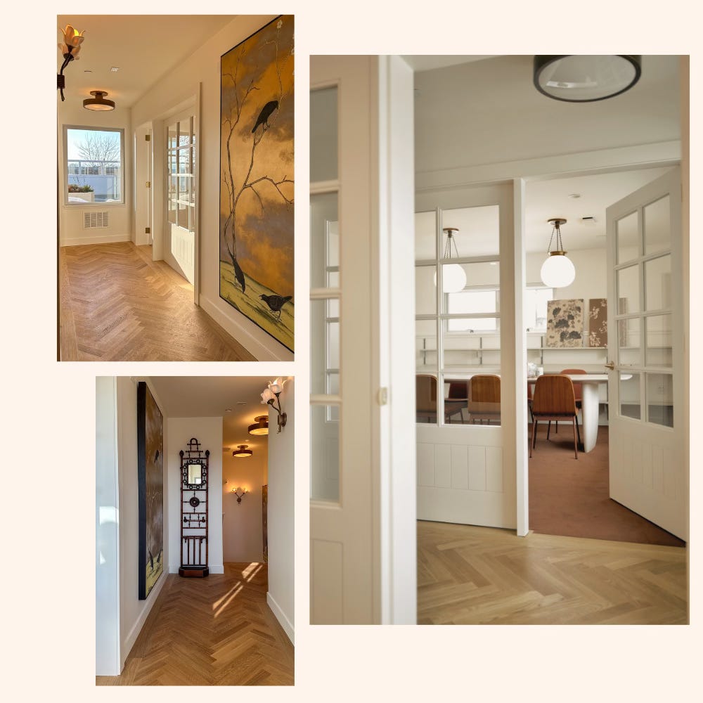 RL: Where to begin? [laughs then looks despondent] Well, having a front door that we don’t need to lock feels like a big deal, and I’m so happy to say good-bye to the dark, grey vibe we had over there [in Oakland]. I was committed to correcting the floor which was lovely over there at first - it was pale oak, but it had too much grey and it added to a dark feeling. Now we have warm oak and it is everything.
