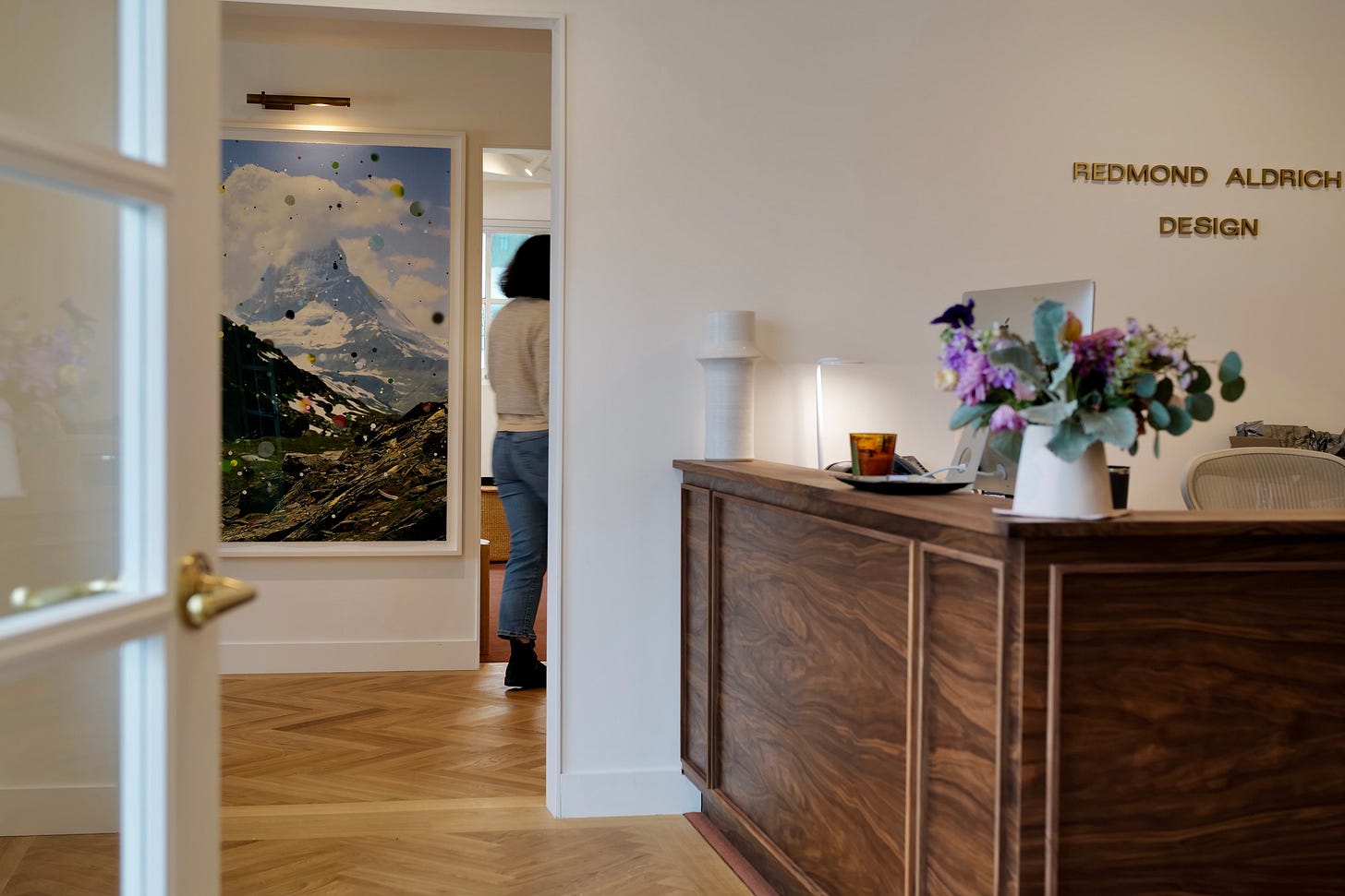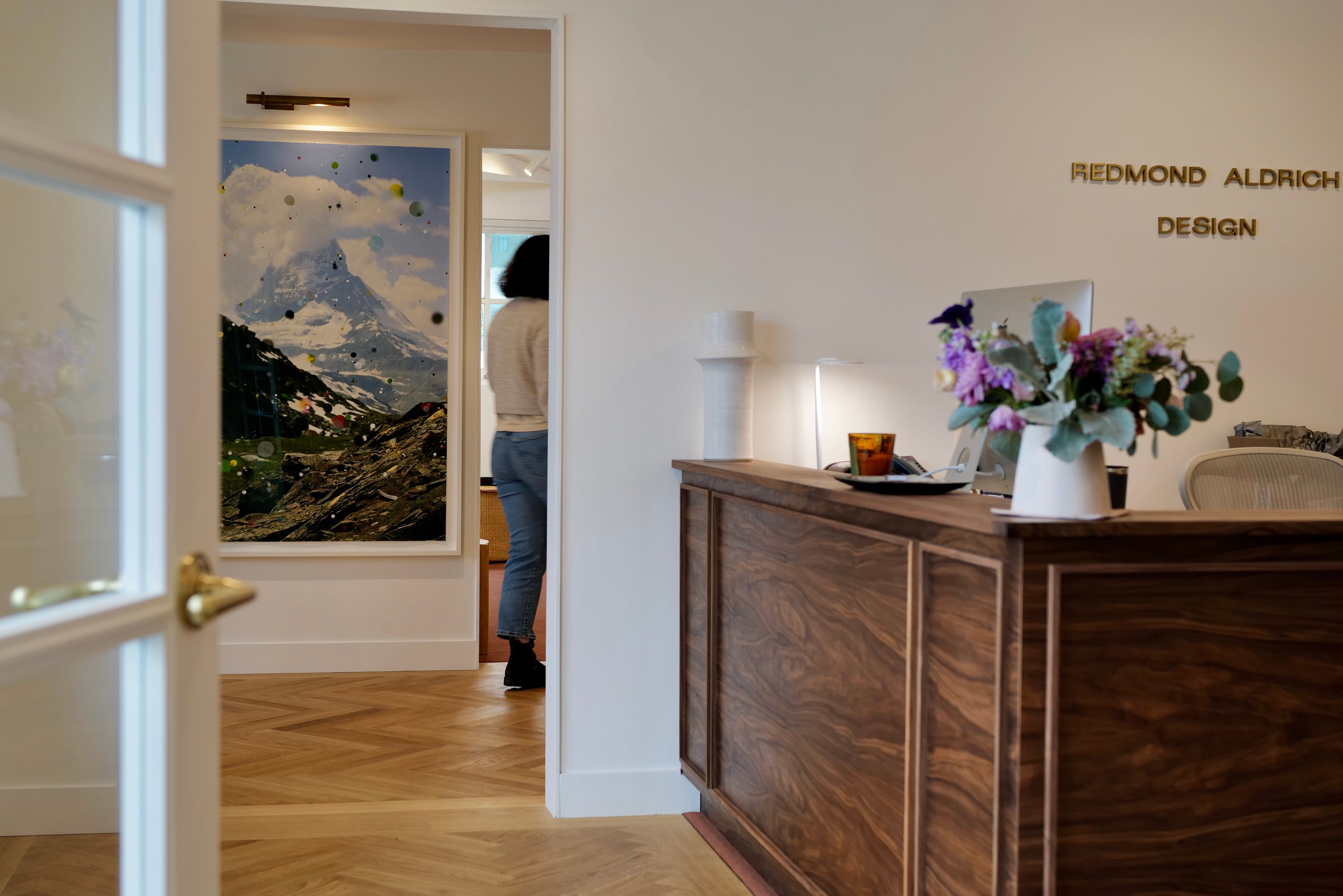 RL: Well, here what I love is even with all the compromises there has been no let-down. All the VE worked. Details I chased paid off; the aligned herringbone, the little brass detail at floor transitions, the lighting plan is a triumph. I feel very proud when people come in and say it feels homey. (Author’s note: I just overheard the building manager tell Rose it didn’t feel like an office up here, he thinks it feels like a “library” and then handed her eight dormant orchid bulbs. Baffling.)