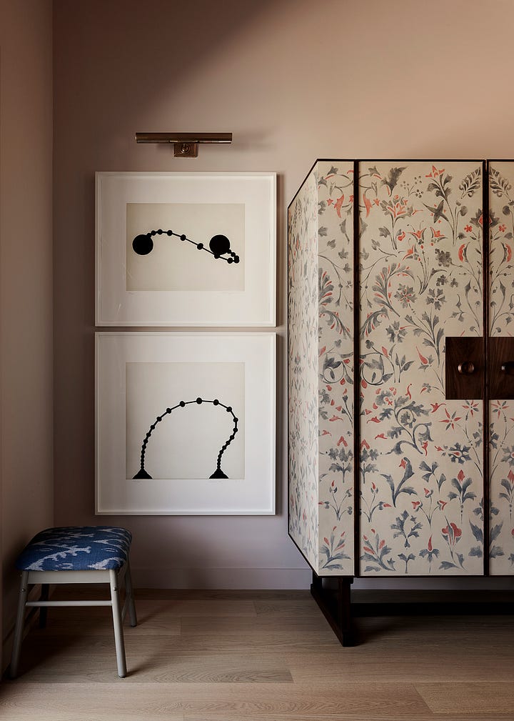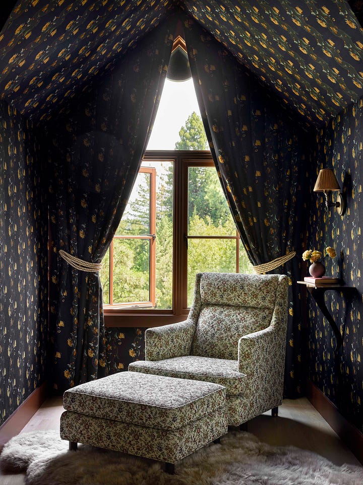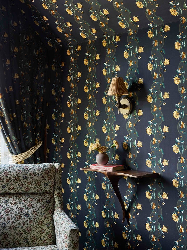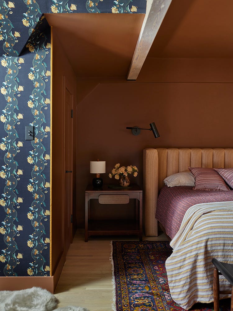 You can choose a pattern, and don’t worry about getting tired of it - I can hear people saying to themselves “it’s 1/3 of your life!” but I point out: “your eyes are closed!” boop! We’re both right. My advice is to pick something pretty that your eyes love. Get sconces and table lamps. Open your heart to a color that might be darker than you would usually go for, and keep a bud vase filled on your nightstand.